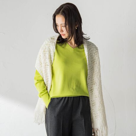 シンプルながらもデコルテをすっきりと見せるVネックラインが女性らしい印象を演出します。