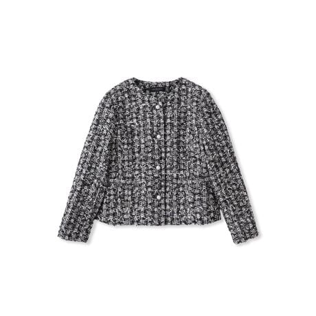 ミニマルなデザインにパールボタンを効かせたクルーネックツイードジャケット。