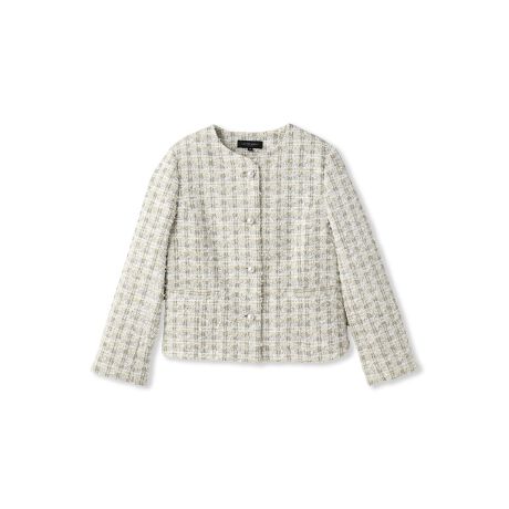 ミニマルなデザインにパールボタンを効かせたクルーネックツイードジャケット。