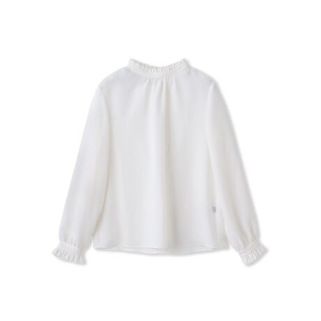 低めのスタンドカラーに小さなフリルをあしらった、上品でフェミニンなブラウス。