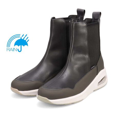 サイドゴアデザインの防水ブーツ。内側にファスナー、外側にゴムが配置されているので足入れしやすい設計となっています。軽量でグリップ性の高いエアソールを採用。4cm4時間の条件付き防水設計。