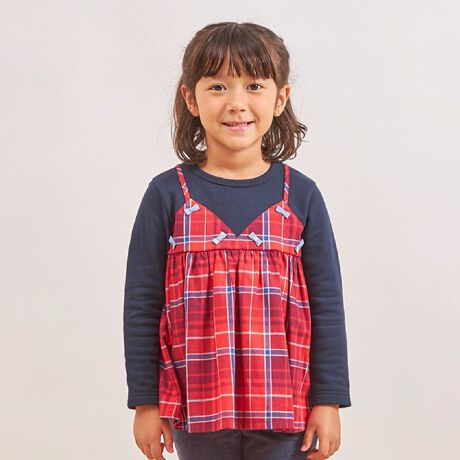 トレーナーに、チェックのキャミソールを重ねて着たように見えるデザイン。胸の小さなリボンと、右裾のmimiちゃんのシルエットのワンポイント刺しゅうが可愛いアクセントです。肩紐が落ちる心配もなく、1枚でレイヤードスタイルが完成。同じチェックの生地づかいのKP BOYのトレーナー (4553203) とは、兄妹でリンクコーデも楽しめます。80、90は、着脱しやすい左肩開きの仕様です。