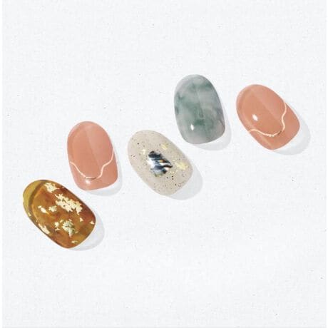 [型番:8809840141827]液体状態の本物のジェルを重ねて半硬化した、シールタイプのジェルネイル。1. 貼る前の準備 2. サイズを合わせて貼る 3. ネイルシールをカットする 4. ジェルランプでかためる