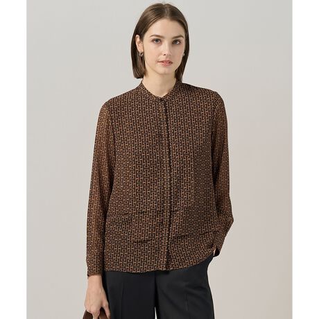 ■デザインプリントの柄を活かしたバンドカラーのブラウスです。フロント部分は素材を重ねて柄の見え方に特徴を出し、ベーシックながらスタイリッシュな印象のデザインに仕上げました。
