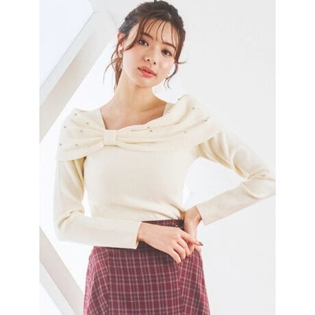 リボン風デザイン×ビジューがスイート?着映え間違いなしのオフショルプルオーバー