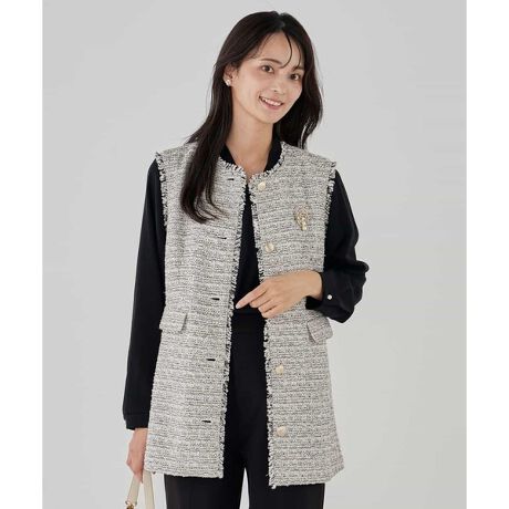 フェミニン派もハンサム派にもおすすめのツイードジレ。