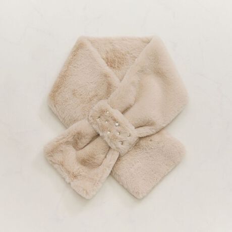 [型番:37-52-60-002]もこもこのエコファー素材がトレンド感のあるスタイリングを演出するティペット。フロントにはパールやビジュー調を施しており、上品で煌びやかなムードを演出します。ループ式になっているため、簡単につけ外しできるのが魅力的。シンプルになりがちなコーディネートに取り入れると、温かみのあるシーズンライクな着こなしが完成します。
