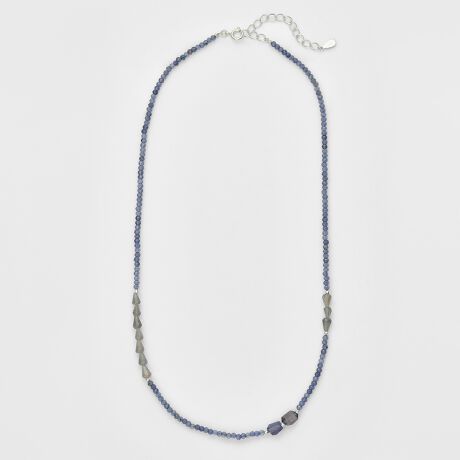深みのある青紫色が魅力のアイオライトを贅沢に連ねたネックレス。ポイントには、ラフカットの大ぶりなアイオライトと、神秘的な色合いが美しいラブラドライトを組み合わせ、表情豊かな輝きをプラスしました。全体を落ち着いたトーンでまとめているため、シンプルながらも洗練された印象に。普段の装いにさりげないアクセントを添え、カジュアルからきれいめまで幅広いスタイルにマッチします。日常使いはもちろん、特別な日にも寄り添うジュエリーです。※天然石や天然素材を使用しているものは、サイズ・色味・風合いの違いや、若干の傷、内包物の有無などに個体差があります。予めご了承ください。※全長に併せて、石の個数は多少差があります。