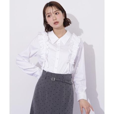肩にあしらったフリルが華やかに映えるブラウス。