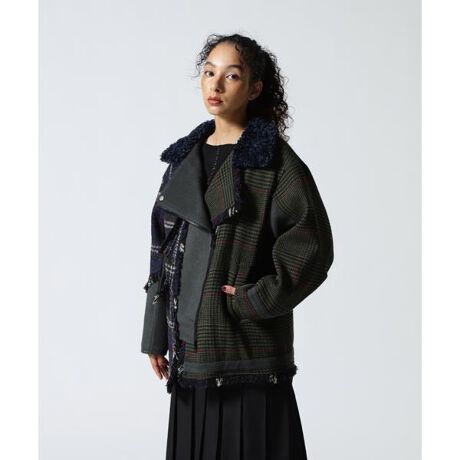 ROYAL FLASH 別注商品左右で中柄と大柄の2種類の大胆なチェックを使用し、中央には無地モッサを組み合わせたマルチコンビネーションブルゾン。カラーもマルチで他にはない目を惹くデザインが毎シーズン人気のおすすめアイテム。フロントは斜めのジップ開きで、ライダースデザインの上襟はくるくるとした羊のフェイクファーがウォーム感を出してくれます。右身頃はツイードチェック生地のフリンジがアクセントになったフラップポケット付きジャケット。左身頃は、裾と袖口にライン入りのアシンメトリーデザイン。◯別注ポイント中綿を入れて、真冬対応も可能にしています。【AULA AILA/アウラアイラ】自分らしさを大切にしながら、魅力を引き出し、何気ない日常に彩りを添え、纏うという高揚感から心を豊かにする、大人のハイエンドカジュアル