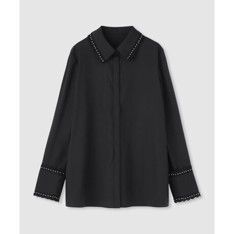 シンプルなシャツカラーと大き目のカフスにスタッズレースをトリミングしたシャツ。