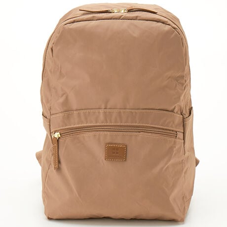 [型番:H0130]折りたたみリュック。収納袋も付いているので、使わない時はリュックを折りたたんで収納しておくことができて便利。リュック背面はスーツケースのキャリーバーに通せる仕様になっているので、旅行時に便利。肩ベルト部分にはDカンがついており、お気に入りのキーホルダーやパスケース、ミニポーチなどすぐに取り出したい物を吊り下げておくことが可能です。容量15Lで収納力もあり、A4が入るサイズ感です。