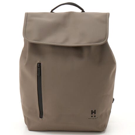 フラップデザインのリュックサック。開閉口の両サイドにはスナップボタンが付いており、スナップボタンを留めたり外したりすることで容量を調節できます。マチ15cm、容量16Lで収納力もあり、A4が入るサイズ感。内装にはノートPCやタブレットを入れるのに便利なポケットも付いています。