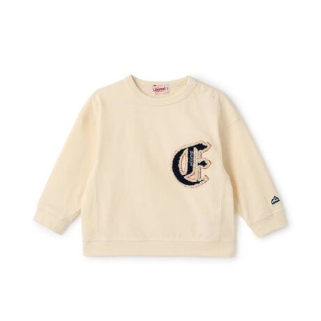 大きなアルファベットのワッペンが特徴的なクルーネックのTシャツです。