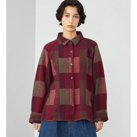 二重織りのパッチワーク風のデザインが特徴的な生地を採用しました。部分的に撚り杢を使用し、メランジ(霜降り)に起毛をかけることで、豊かな表情のツイード感を表現。より奥行きのあるパッチワーク感を出すため、それぞれ異なる組織(織り方)を組み合わせるこだわりが詰まっています。一つ一つのアイテムで柄の見え方が異なるため、あなただけの特別な一着を見つける楽しみも。