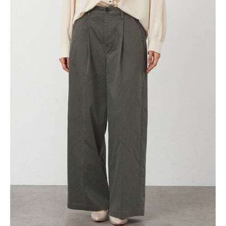 裾に向かって緩やかに広がるワイドシルエットは、脚のラインを拾わず、落ち感のある素材と相まってこなれた印象を与えます。ウエスト部分に入ったタックが縦のラインを強調し、視覚的に重心を高く見せることでスタイルアップ効果を発揮。同時に気になるお腹周りも自然に体型カバーしてくれます。バックポケットは上品な玉縁仕様なので、ビジネスシーンでのきちんと感を損なわず、オフィスでの着用にもぴったり。快適な穿き心地でありながら、洗練された着こなしを叶える一本です。