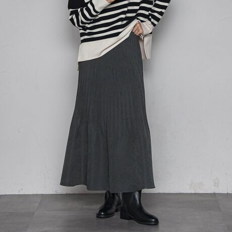 スウェードライクな質感と、女っぽいシルエット、気分色づく消しプリーツスカート。