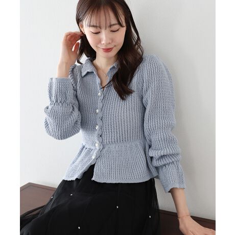 裾のペプラムデザインとパールボタンで、女性らしいポイントを与え、ウエスト周りの体型を自然にカバーします。