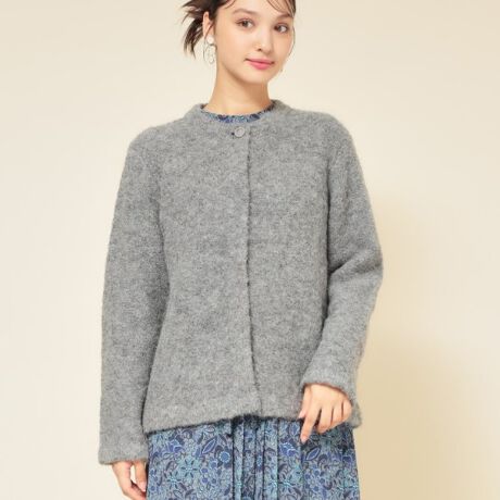 素材感に特徴のあるヘアリーなループヤーンを使った、クルーネック、セットインでヒップにかかる丈のシンプルな羽織りです。