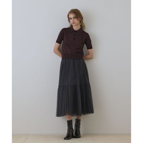 繊細なチュール素材にプリーツ加工を施した、端正な表情とフェミニンなデザインが美しく調和した一枚です。たっぷり用尺をとった華やかな蹴回しとティアードテクニックでボリューム感を出した、優美なシルエット。歩く度に優しく揺れる、柔らかでニュアンスのある表情が魅力的なデザインです。