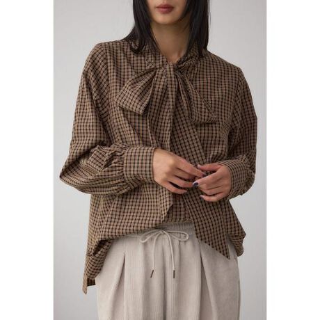 ■ボウタイリボンブラウス■ポイント大きめなリボンが華やかさを添える、トレンドのボウタイブラウス。秋にぴったりのチェック柄を含めた3色展開です。 ■ディテール首元のリボンは結び方次第で印象を変えられ、華やかにもシンプルにもアレンジ可能。フェミニンになりすぎないように、フロントはボタンデザインを入れてモードさをプラス。ふんわりとした袖に長めのカフスを施し、女性らしいかつ上品な雰囲気に。秋冬に着用しやすいしっかりした素材で、上品かつ快適な着心地です。アウトでもインでもバランスよく着こなせるシルエットです。■スタイリングテーパードパンツやタイトスカートと合わせてきちんと感のあるオフィスコーディネートでも◎。デニムと組み合わせてカジュアルダウンするのもおすすめです。ジャケットインやカーディガンのインナーにも映える万能アイテムです。■生地無地2色は高密度で程よいハリ感があり、リボンが綺麗に形作れます。柄BRNは無地と比べると、やや柔らかめの風合いです。透け感:なし裏 地:なし伸縮性:なし光沢感:なし[注意事項]※画像の商品はサンプルです。実際の商品と仕様、加工が若干異なる場合があります。※画像の商品は光の照射や角度、お使いのモニター環境により、実物と色味が異なる場合がございます。※着用、お取り扱いの際は、アテンションタグをご確認ください。