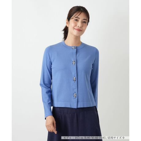 レーヨン混のしなやかな糸で編み立てたカーディガン。フロントに配した繊細なビジューパーツが、さり気ない輝きを添えています。