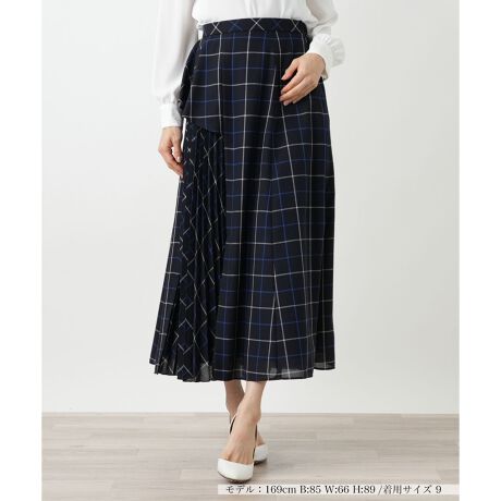 トラッドな雰囲気のタッタソールチェックに、プリーツとフリルを大胆に組み合わせた主役級のロングスカート。歩くたびに揺れるサイドのプリーツと、流れるようなアシンメトリーデザインが見る角度によって豊かな表情を生み出します。ウエストのフロント部分はすっきり見せつつ、後ろはゴム仕様で心地よくフィットし穿き心地も快適。シンプルなトップスを合わせるだけで、華やかで動きのある秋のスタイルが完成します。スナップボタン&ホック、ファスナーにより開閉可能。