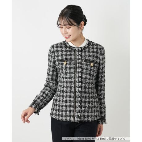 起毛感のある表情豊かな素材が、シーズンムードを高めるノーカラージャケット。胸元で煌めくゴールドの飾りボタンが、クラシカルな中にラグジュアリーな雰囲気をプラス。フロントやネックラインにあしらわれたブレードトリムが、デザインを引き締めるアクセントに。フロントは鍵ホックですっきりと仕上げており、前を開けて羽織っても様になります。オケージョンから普段使いまで、着こなしをクラスアップさせてくれる主役級の一着です。