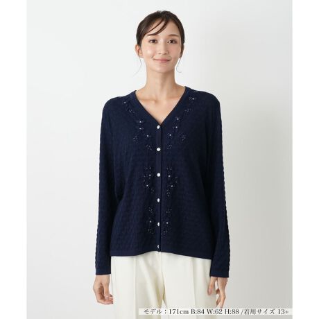 イタリアのニットファクトリーメーカー「CORSINI & PROTI」による、洗練されたカーディガン。イタリア「ゼニアバルファ」社の毛を100%使用した12ゲージの編地は、幾何学模様のような組織が特徴です。手作業で施された花柄の刺繍と輝きのある装飾、そしてクリスタル調ボタンが、繊細で華やかな印象を一層引き立てます。ニットの編地はもちろん、ハンドメイドならではの非常に繊細な刺繍が他にない物作りをしています。深みのあるVネックデザインは、首元を美しく見せ、様々なインナーとのレイヤードをお楽しみいただけます。大人の女性の日常を豊かに彩る、芸術性と快適さを兼ね備えた一枚です。