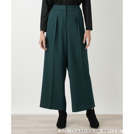 センタープレスがきれいなシルエットを叶える、ワイドパンツです。ウールライクなポリエステル素材を使用しており、しわになりにくくイージーケア。ウエストゴム仕様で快適な履き心地ながら、上品な印象を与えます。
