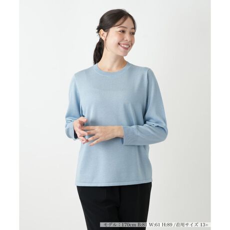 イタリアの光沢糸と毛をブレンドし、高度なプレーティング編みで丁寧に仕立てたセーター。光沢糸を表面に、毛を裏面に配することで、適度な光沢感とハリ感が特徴です。ノーカラーの丸首デザインは、どんな装いにも上品に馴染みます。ふっくらと柔らかな肌触りで、快適な着心地が魅力です。一枚で着映えする洗練された一着で、お客様の装いを豊かに彩ります。