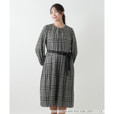 表情のあるチェック柄プリントがエレガントなワンピースです。つややかなポリエステルサテン素材は、落ち感がありしわになりにくいのが特徴。脇のプリーツ加工が動くたびに優雅な揺れ感を演出し、付属のグログランリボンベルトでウエストマークすれば、さらにスタイルアップ効果も期待できます。