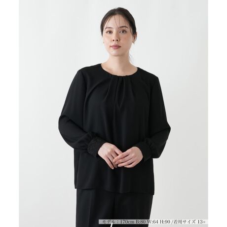 上品な光沢と美しいドレープが魅力の、長袖ブラウス。ポリエステル素材を使用しており、しなやかな肌触りと適度なハリ感を兼ね備えています。襟元には繊細なレースがあしらわれ、さりげない華やかさを添えています。ご自宅で手洗いできるウォッシャブル仕様で、日常のお手入れも簡単。シンプルな無地デザインながらも、異素材の組み合わせが洗練された印象を与え、一枚で着ても様になります。ジャケットやカーディガンのインナーとしても活躍し、幅広いスタイルにお召しいただけます。