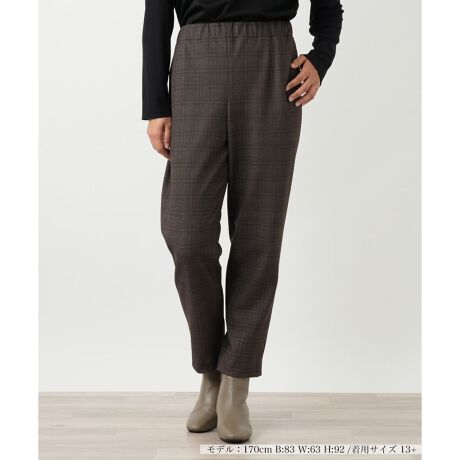 暖かな着心地と美しいシルエットを両立する、冬に嬉しいスリムパンツ。機能的なポリエステル混素材にポリウレタンを混紡することで、快適なストレッチ性を実現いたしました。上品なチェック柄が、コーディネートに洗練されたアクセントを添えます。ご自宅で手洗いできるウォッシャブル仕様で、お手入れも簡単。ウエストはゴム入りで、窮屈感なく快適にお召しいただけます。フィット感がありながらも、体を締め付けすぎない絶妙なサイズ感で、脚のラインをすっきりと見せてくれます。大人の女性の多様なライフスタイルに寄り添う、機能性とデザイン性を兼ね備えた一本です。