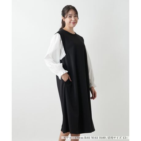 ボリューム袖のブラウスとジャンパースカートをレイヤード風に仕上げたデザインワンピースです。一枚でサマになる便利なアイテム。ブラウス部分は適度なハリとコシのあるブロード素材、ボディ部分は伸縮性のあるジャージー素材を使用。きれい見えするAラインシルエットが魅力です。