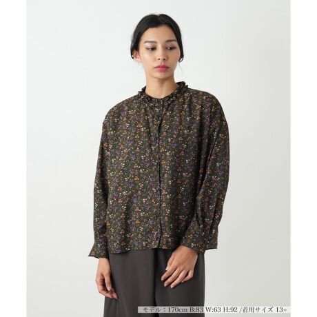ポリエステル素材を使用した、秋の装いを華やかに彩る、花柄が美しいスタンドカラーシャツブラウス。クラシカルなシャツカラーと長袖のデザインが、洗練された大人の女性の品格を演出いたします。ご自宅で手洗いできるウォッシャブル仕様で、日常のお手入れも簡単。一枚で着ても華やかな存在感を放ち、ジャケットやカーディガンのインナーとしても上品に映えます。落ち着いた色合いの花柄が、秋のコーディネートに優雅なアクセントを添える、BOURGEらしいエレガントな一枚です。