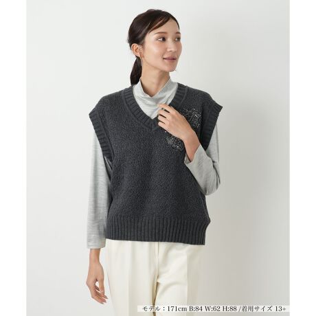 イタリアのニットファクトリーメーカー「CORSINI & PROTI」が手がける、上質で洗練されたVネックニットジレ。イタリア「ゼニアバルファ」社の上質な毛を100%使用した7ゲージの編地は、暖かく柔らかな肌触りです。特徴的な編み柄が個性を放ち、胸元に配されたレースアップリケが高級感を一層引き立てます。ニットの編地はもちろん、ハンドメイドならではの非常に繊細な刺繍が他にない物作りをしています。シャツやブラウス、薄手のニットなど、様々なインナーとレイヤードすることで、幅広いスタイルをお楽しみいただけます。季節の変わり目の羽織りとして、またコーディネートのアクセントとして活躍する魅力的な一枚です。