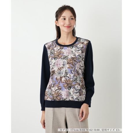 イタリア製生地「ERICA(エリカ)」を使用した、美しい花柄プリントのセーター。毛100%の暖かな編地と、上品な光沢とドレープが美しい織地の切り替えデザインが特徴で、華やかな印象を演出します。裏地付きで、快適な着心地。ノーカラーの丸首デザインは、デコルテラインを美しく見せ、アクセサリーも引き立てます。一枚で着るだけで様になり、秋冬のコーディネートを彩る主役となるでしょう。特別な日のお出かけはもちろん、普段の装いを格上げする一枚として、大人の女性のエレガンスを演出いたします。