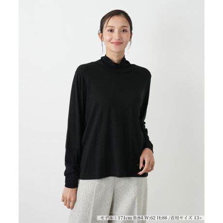 柔らかな肌触りと品の良さが魅力の、長袖カットソー。レーヨン、コットン、アクリルをブレンドした素材は、しなやかで心地よい肌触りです。袖の一部にはゴムシャーリングとチュール素材の切り替えが施され、さりげないデザイン性が光ります。上品なハイネックは首元を優しく包み込み、これからの季節にぴったりです。ご自宅で手洗いできるウォッシャブル仕様で、日常のお手入れも簡単。一枚で着ても様になり、ジャケットやカーディガンのインナーとしても活躍し、幅広いスタイルにお召しいただけます。秋のワードローブに欠かせない、上質で着回し力の高いアイテムです。