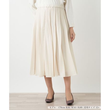 軽やかなオーガンジー素材を使用したプリーツスカート。ポリエステル独自の美しい光沢感と、透け感が魅力です。ウエスト下のプリーツから裾にかけてプリーツの形状が変化するデザインが特徴で、歩くたびに優雅な動きが生まれます。無地ながらも表情豊かな生地感で、様々なトップスと合わせやすい一枚。ウエストはゴム仕様で、快適な履き心地です。裏地付きで透け感を気にせず、安心してご着用いただけます。上品な透け感と美しいドレープが、装いを華やかに引き立てます。