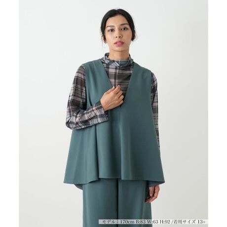 なめらかな素材感のVネックベストです。サイドに広がるフレアシルエットが、体型をカバーしながらも、動きのある女性らしい印象を与えます。深めのVネックは、インナーのトップスを際立たせ、レイヤードスタイルを楽しめます。裾はアシンメトリーなカッティングで、軽やかな抜け感を演出。カジュアルなトップスからきれいめなブラウスまで、幅広いアイテムと好相性です。同素材のボトムスと合わせれば、統一感のある洗練されたセットアップスタイルが完成します。