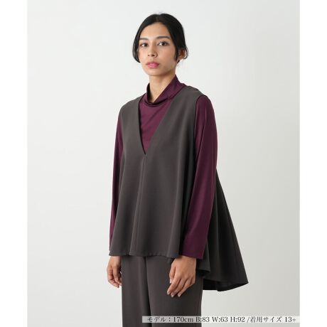 なめらかな素材感のVネックベストです。サイドに広がるフレアシルエットが、体型をカバーしながらも、動きのある女性らしい印象を与えます。深めのVネックは、インナーのトップスを際立たせ、レイヤードスタイルを楽しめます。裾はアシンメトリーなカッティングで、軽やかな抜け感を演出。カジュアルなトップスからきれいめなブラウスまで、幅広いアイテムと好相性です。同素材のボトムスと合わせれば、統一感のある洗練されたセットアップスタイルが完成します。