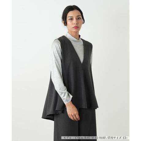 なめらかな素材感のVネックベストです。サイドに広がるフレアシルエットが、体型をカバーしながらも、動きのある女性らしい印象を与えます。深めのVネックは、インナーのトップスを際立たせ、レイヤードスタイルを楽しめます。裾はアシンメトリーなカッティングで、軽やかな抜け感を演出。カジュアルなトップスからきれいめなブラウスまで、幅広いアイテムと好相性です。同素材のボトムスと合わせれば、統一感のある洗練されたセットアップスタイルが完成します。
