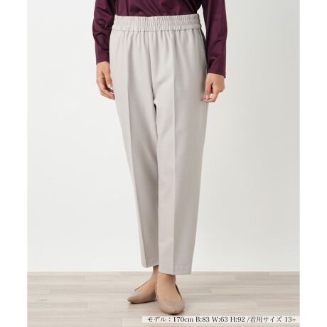 ポリエステルを主体とした素材にレーヨン、アクリル、ポリウレタンをブレンドした、快適な穿き心地のパンツ。しなやかな肌触りと優れたストレッチ性で、快適な着用感。ご自宅で手洗いできるウォッシャブル仕様で、日常のお手入れも簡単です。ウエストはゴム入りで、窮屈感なくフィット。脚のラインをすっきりと見せる細身のシルエットは、様々なトップスと合わせやすく、着回し力も抜群です。秋のデイリースタイルから、きれいめなオフィススタイルまで幅広くお楽しみいただける一本です。