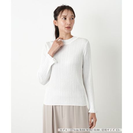 プレーティング編みのラメニットが上品に輝くボトルネックセーター。秋の装いを華やかに彩る、洗練された無地デザインです。ラメ糸が表側のみに出るように編み込まれているため、肌に直接当たることがなく、快適な着心地をお楽しみいただけます。適度にゆとりのあるランダムリブが身体に程よくフィットし、ハイネックは首元を優しく包み込みます。同シリーズのカーディガンと合わせれば、統一感のあるラメニットアンサンブルが完成。特別な日のお出かけはもちろん、普段の装いを格上げする一枚として、大人の女性のエレガンスを演出いたします。