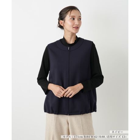 快適な着心地と美しいシルエットを両立する、ジャージータイプのベスト。ポリエステル、レーヨン、ポリウレタンをブレンドした素材は、しなやかな肌触りと優れたストレッチ性を特徴としています。ご自宅で手洗いできるウォッシャブル仕様で、日常のお手入れも簡単。前ジップで着脱しやすく、丸首デザインがすっきりと洗練された印象を与えます。シンプルな無地デザインなので、様々なインナーやボトムスと合わせやすく、着回し力も抜群です。秋の始まりには軽やかな羽織りとして、冬にはジャケットのインナーとして、長くご愛用いただけるでしょう。大人の女性の多様なライフスタイルに寄り添う、上質なアイテムです。