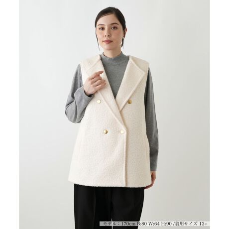 立体感のあるブークレ素材が特徴の、ダブルブレストベストです。ふっくらとした素材感とテーラードカラーが、上品で暖かみのある印象を与えます。フロントに配されたゴールドのボタンが、クラシカルなアクセントとなり、全体を華やかに引き締めます。ゆったりとした身幅は、ブラウスや薄手のニットなど、様々なインナーとのレイヤードスタイルを楽しめるデザイン。普段のコーディネートにプラスするだけで、洗練された大人のスタイルが完成します。