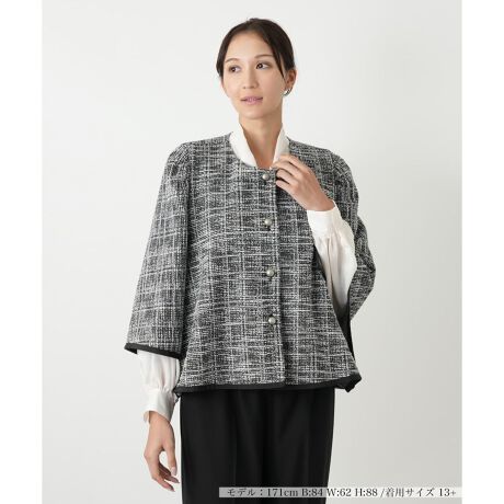 表情豊かなミックスツイード素材が魅力のポンチョ風ジャケットです。ノーカラーの首元と丸みのあるシルエットが、女性らしい柔らかな印象を与えます。フロントのアンティーク調のボタンがアクセントとなり、上品な雰囲気をプラス。袖口からインナーを覗かせるデザインは、レイヤードスタイルをより豊かにします。羽織るだけで華やかさとこなれ感を演出でき、デイリーユースはもちろん、ちょっとしたお出かけにも活躍する、着回し力の高い一枚です。