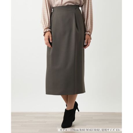 なめらかなとろみ素材が上品なミモレ丈スカートです。ウエストにタックを施し、自然なフレアシルエットが女性らしい優雅な雰囲気を演出します。広がりすぎない上品なAラインは、オフィスから普段使いまで幅広いシーンに対応。シンプルなデザインなので、柄物のトップスやデザインブラウスとも相性が良く、着回し力も抜群です。足元はヒールを合わせることで、よりきれいめな印象に仕上がります。