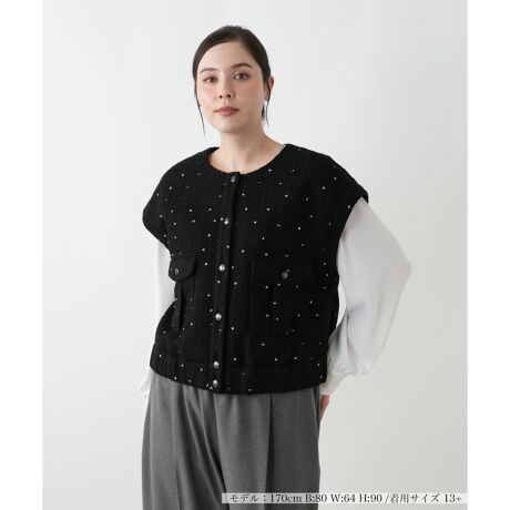 ツイード調の表情豊かな素材に、小さなビジューが散りばめられた上品なベストです。ラメ糸が織り込まれたようなきらめきが、華やかな印象を与えます。ノーカラーのクルーネックデザインと、フロントのボタンがすっきりとした印象。両胸にはフラップポケットが配されており、デザインのアクセントになっています。カットソーやブラウスとの重ね着はもちろん、ワンピースの上に羽織るだけで、普段のコーディネートをワンランクアップさせます。